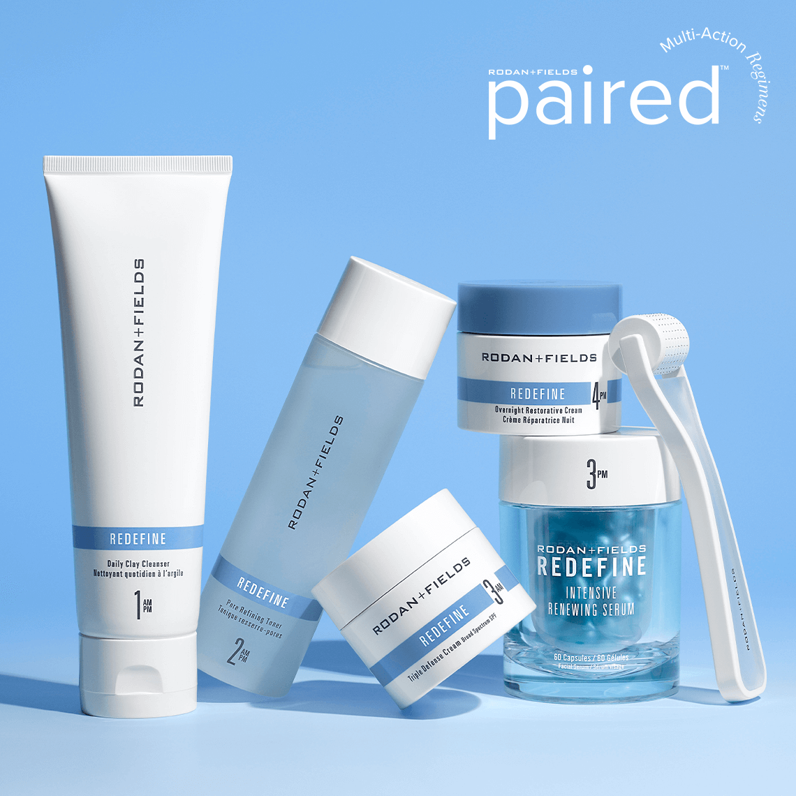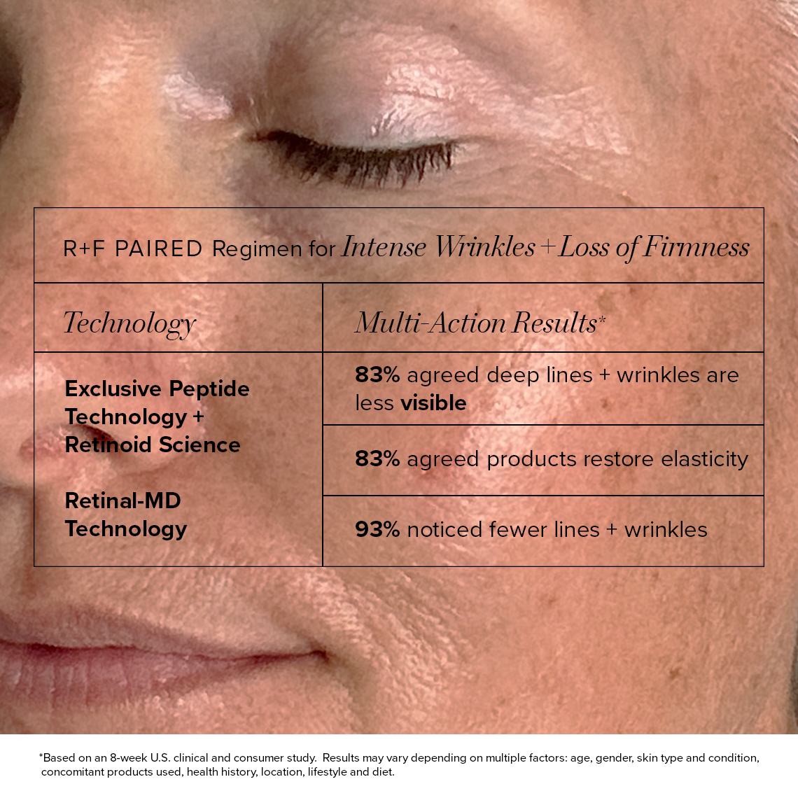 R+F PAIRED Regimens are personalized Regimens that address multiple skin concerns simultaneously. To address concerns of lines, deep wrinkles, loss of plumpness, uneven texture + loss of firmness or now looking for more from your REDEFINE Regimen, we recommend using R+F PAIRED Regimen for Intense Wrinkles + Loss of Firmness. This regimen will visibly firm, minimize lines + wrinkles and improve skin plumpness and fullness by supporting the skin’s natural renewing process. If you have mild to moderate concerns of fine line + wrinkles and loss of firmness we recommend starting with the REDEFINE Regimen and switching to R+F PAIRED Regimen for Intense Wrinkles + Loss of Firmness when needed.