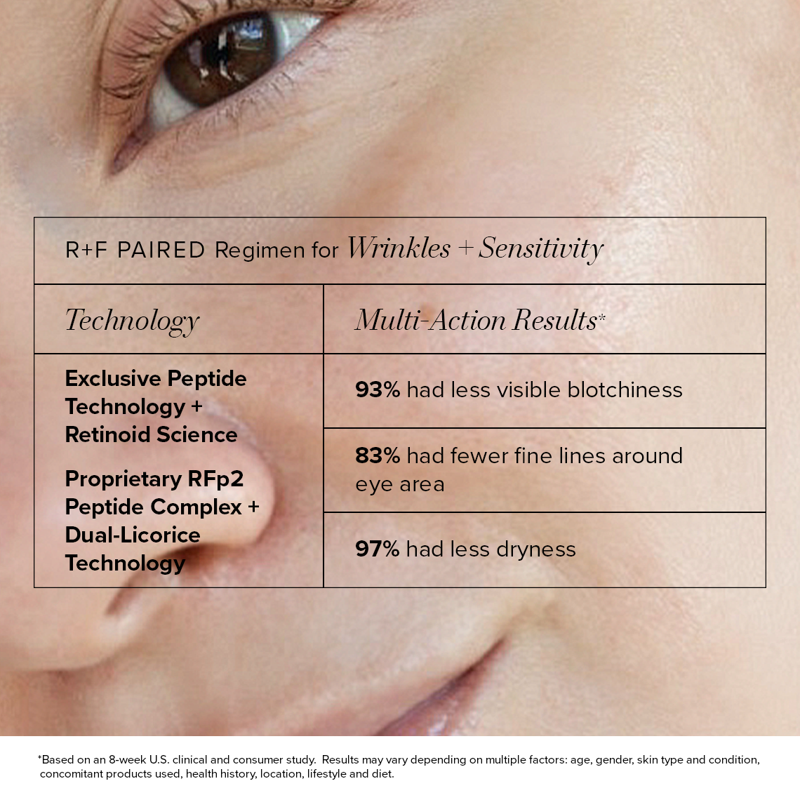 R+F PAIRED Regimen for Wrinkles + Sensitivity contains Peptide Technology, Botanical Extracts, Retinoid Science, and Proprietary RFp2 Peptide Complex + Dual-Licorice Technology to address primary concerns of lines, wrinkles, rough skin texture and secondary concerns of visible redness, irritation, sensitivity, dryness. This perfectly personalized Regimen features a precise pairing of products that contain the right ingredients, in the right formulation, used in the right order, with every step building on the last.