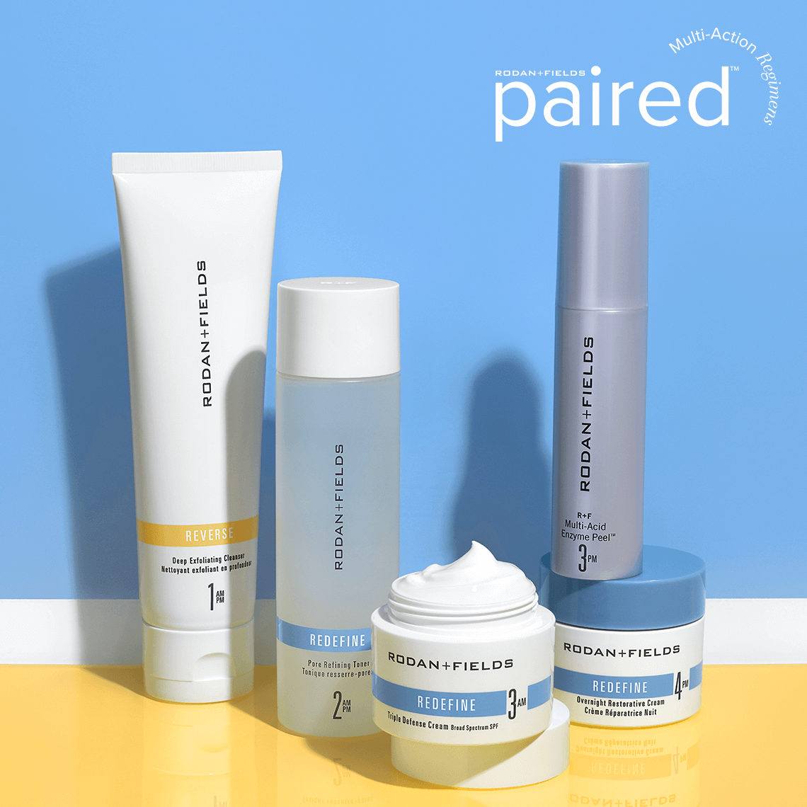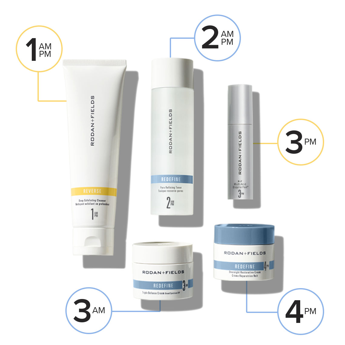 • Step 4 PM - REDEFINE Overnight Restorative Cream or Reparative Lotion - Apply liberally and evenly over face + neck.